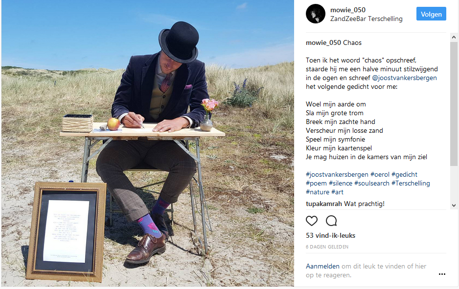 Met veel genoegen maakte Joost in 2014 en 2017 deel uit van het guerrilla programma van Oerol. Hij ontwikkelde een interactieve poëtische performance als zwijgzame (snel)dichter. Meer dan 2000 persoonlijke stukjes heeft hij dankbaar mogen schrijven voor de geweldige bezoekers van dit festival.