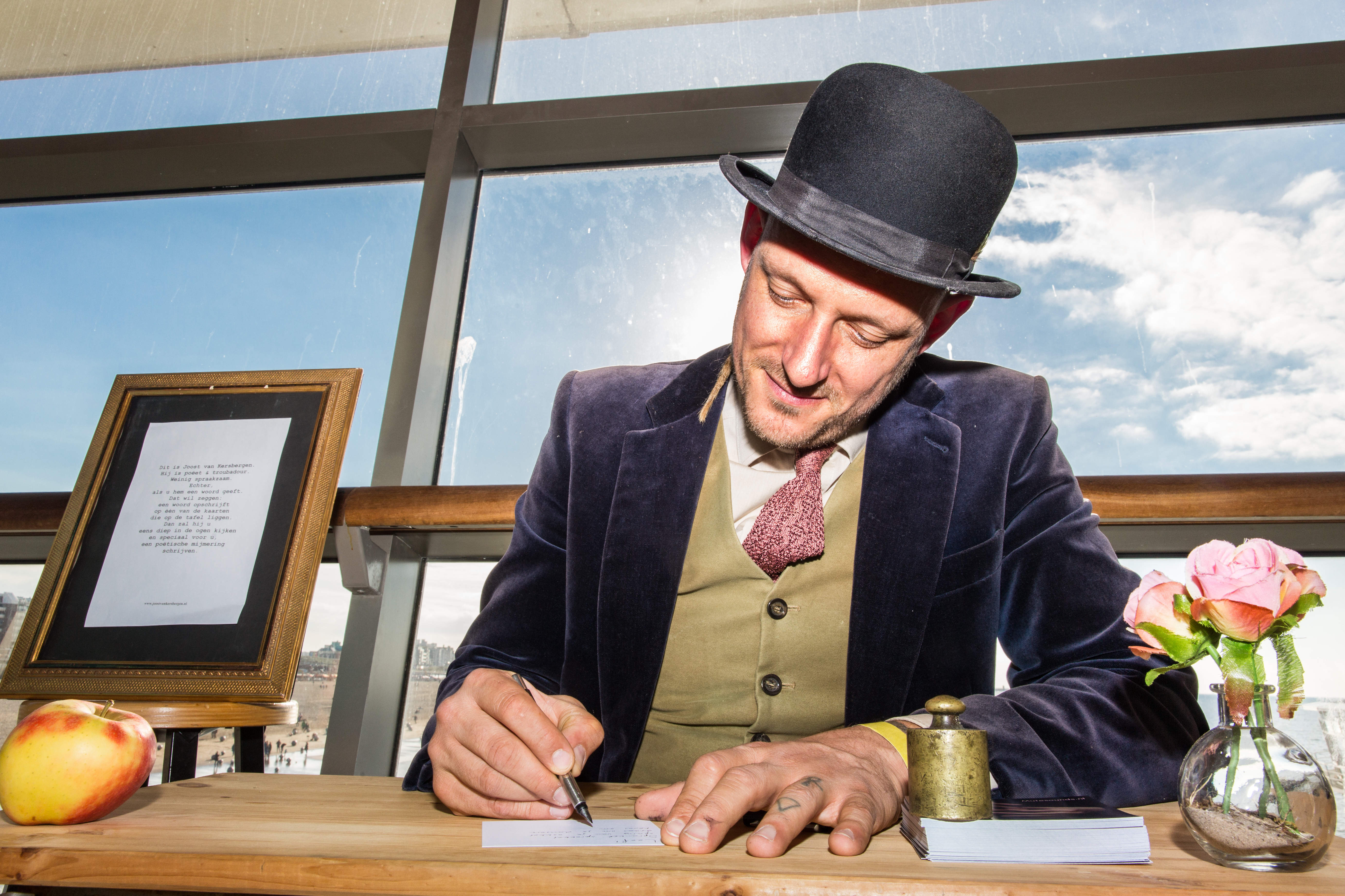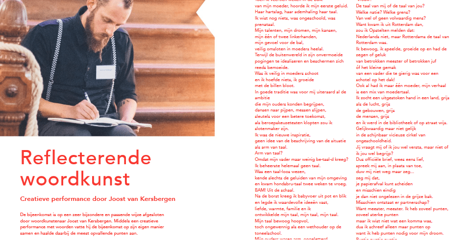 Voor instellingen, bedrijven en andere organisaties schrijft Joost poëtische impressies (wrap-ups) tijdens evenementen of bijeenkomsten. Ook bedenkt en/of maakt hij in opdracht van onder andere festivals en evenementen, op maat gesneden poëtische belevenissen. Joost denk graag met u mee om een mooie en passende creatieve beleving te realiseren, in de breedste zin van het woord!